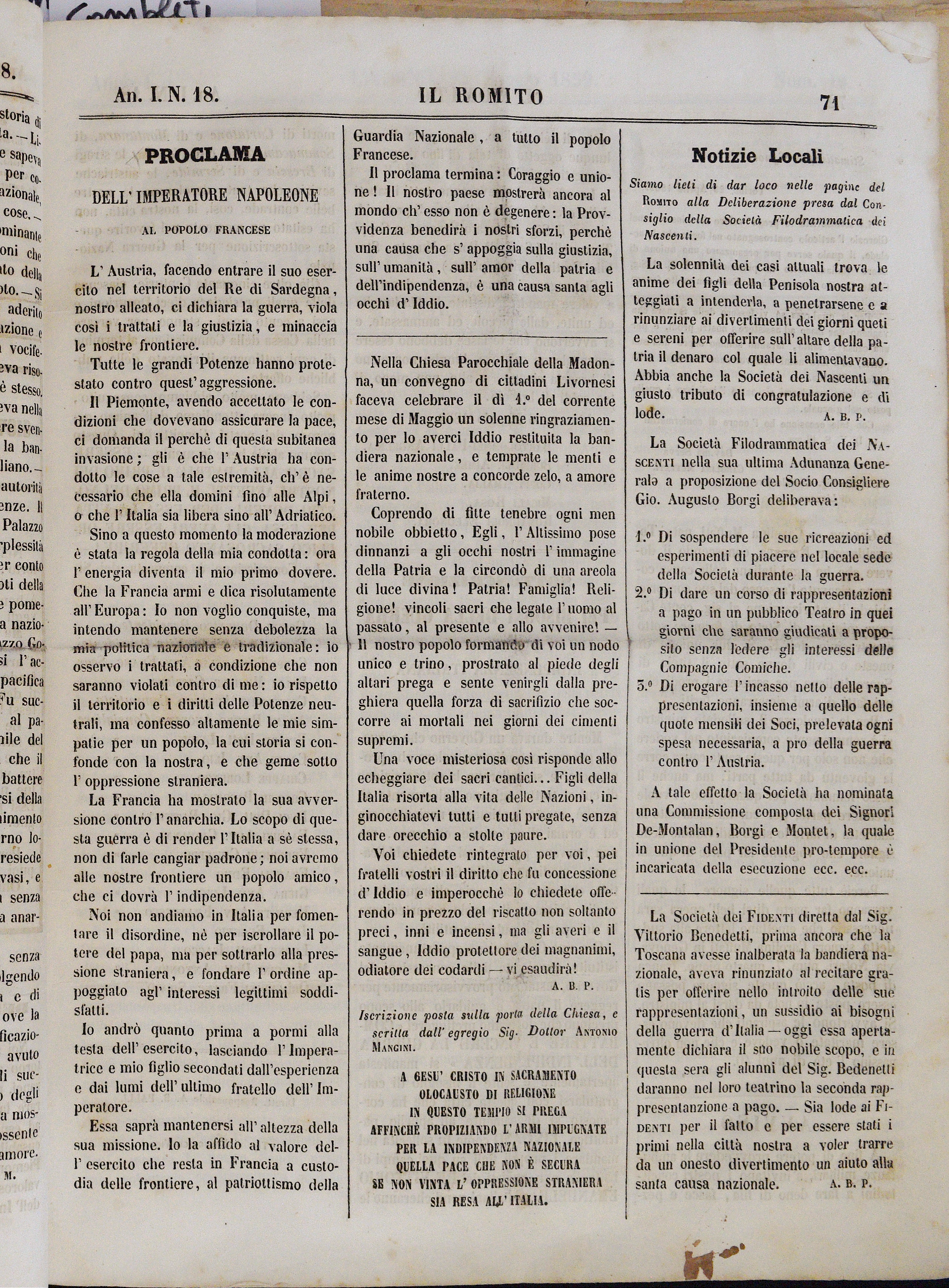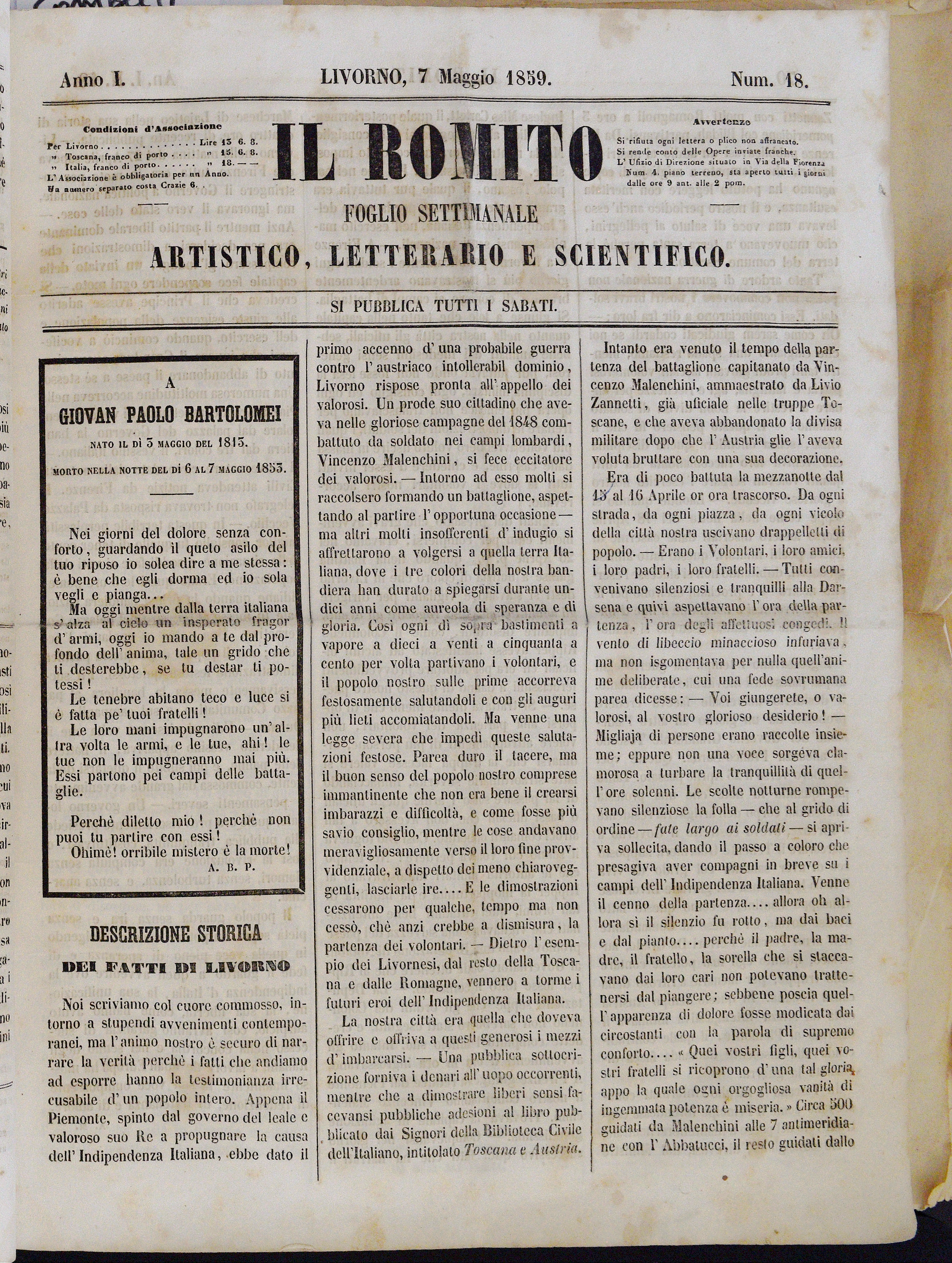 Anno I. Num. 18. Livorno, 7 Maggio 1859