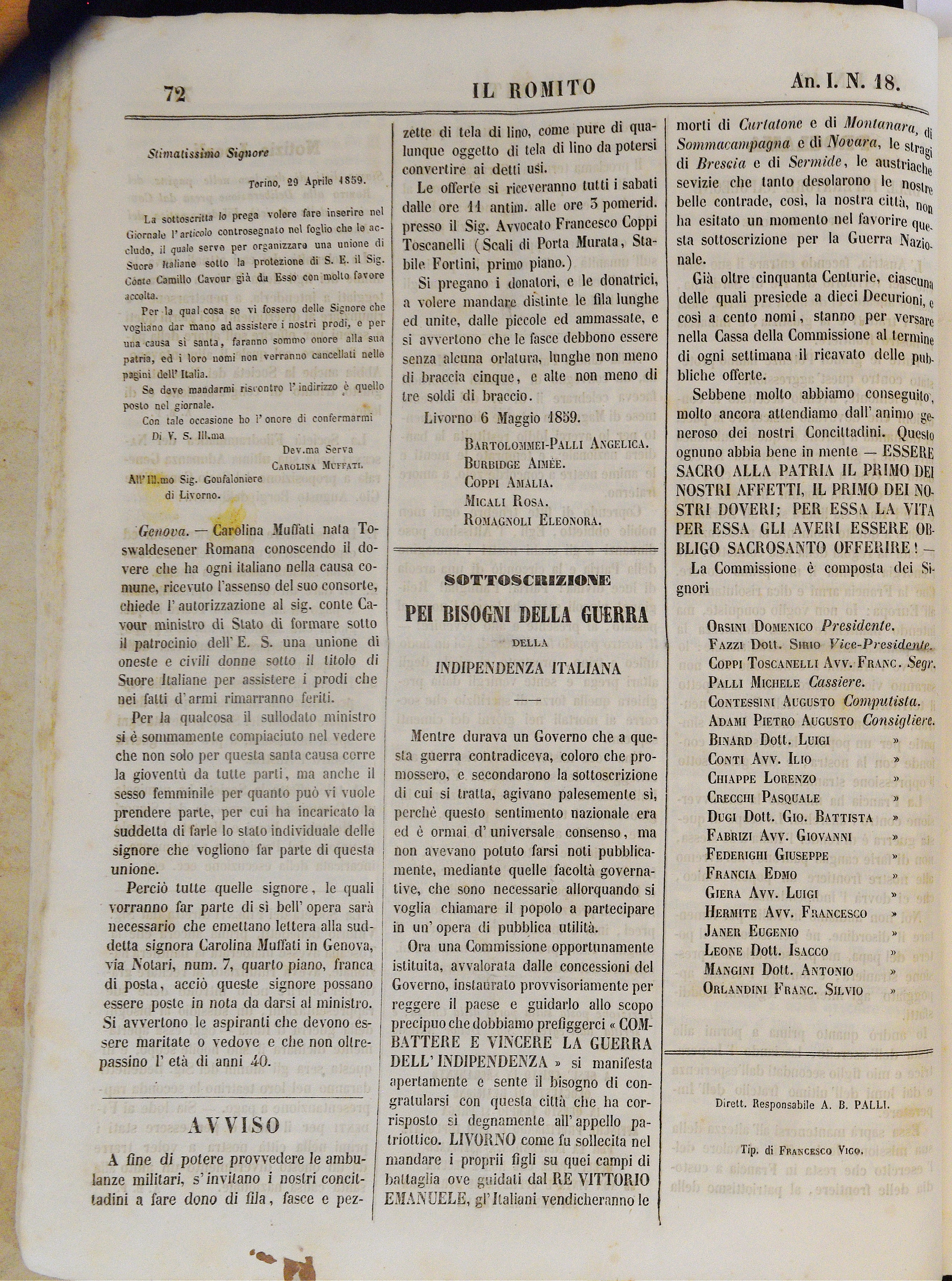 Carolina MuffatiLettera all’Ill.mo Sig. Gonfaloniere di Livorno per ottenere l’autorizzazione di formare una unione femminile per assistere i feriti in guerrapp. 72