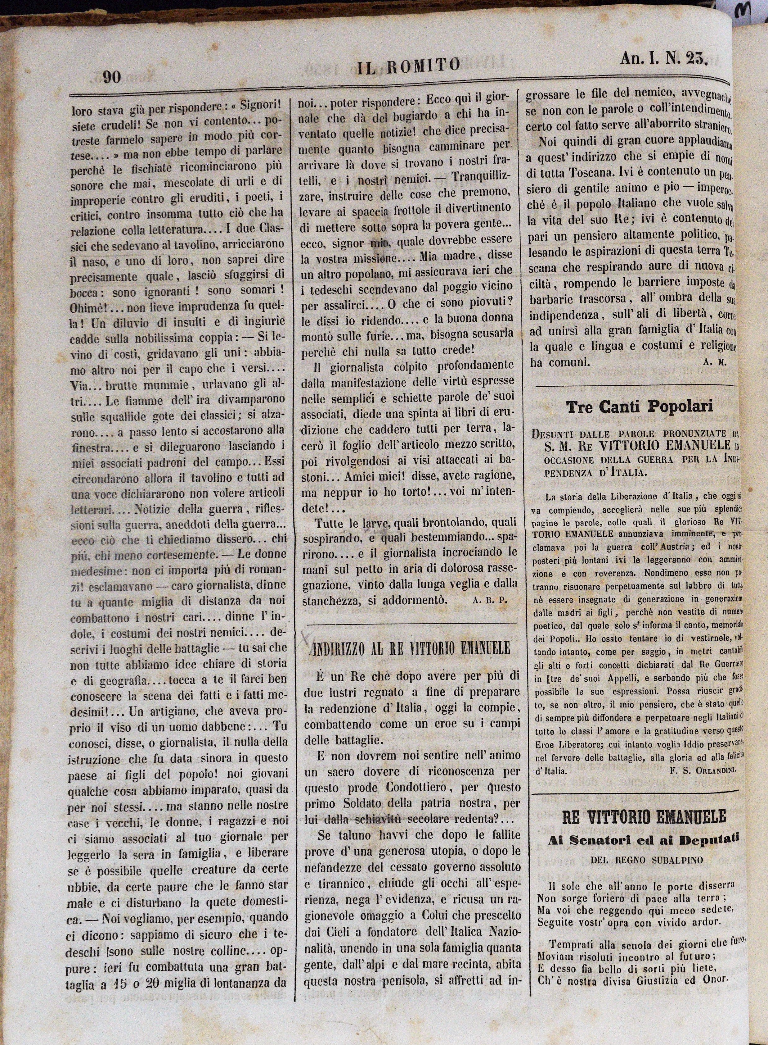 F. S. OrlandiniTre Canti Popolari desunti dalle parole pronunziate da S. M. Re Vittorio Emanuele in occasione della guerra per la Indipendenza d’Italiapp. 90