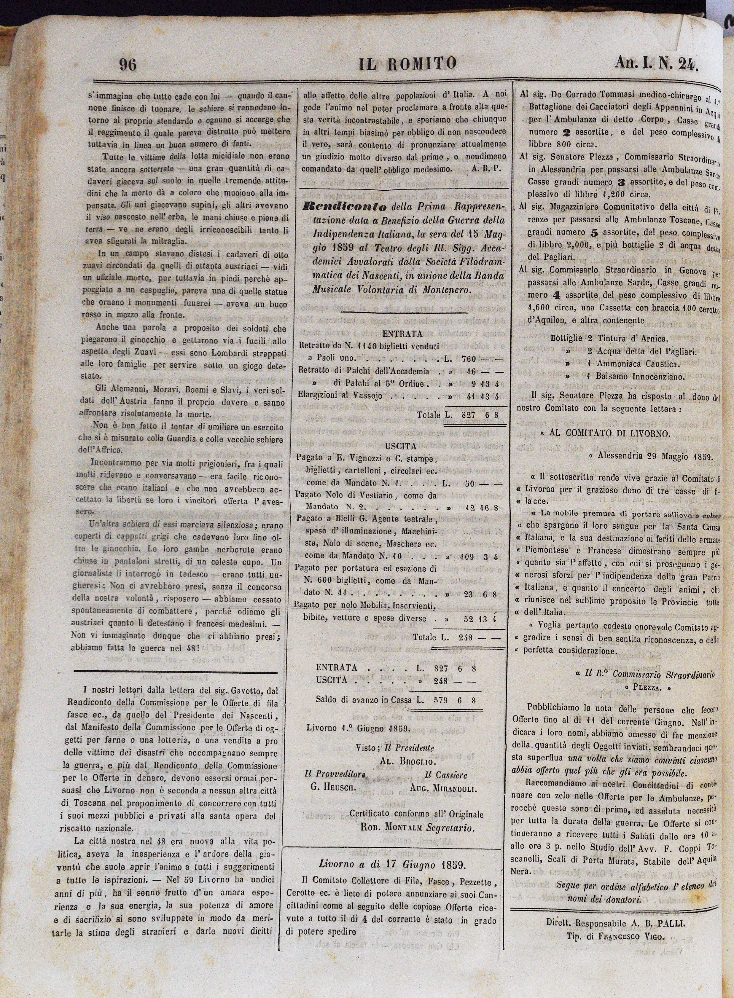 Rendiconto della Prima Rappresentazione data a Benefizio della Guerra della Indipendenza Italiana, la sera del 15 Maggio 1859 al Teatro degli Ill. Sigg. Accademici Avvalorati dalla Società Filodrammatica dei Nascenti, in unione della Banda Musicale Volontaria di Montenero.pp. 96