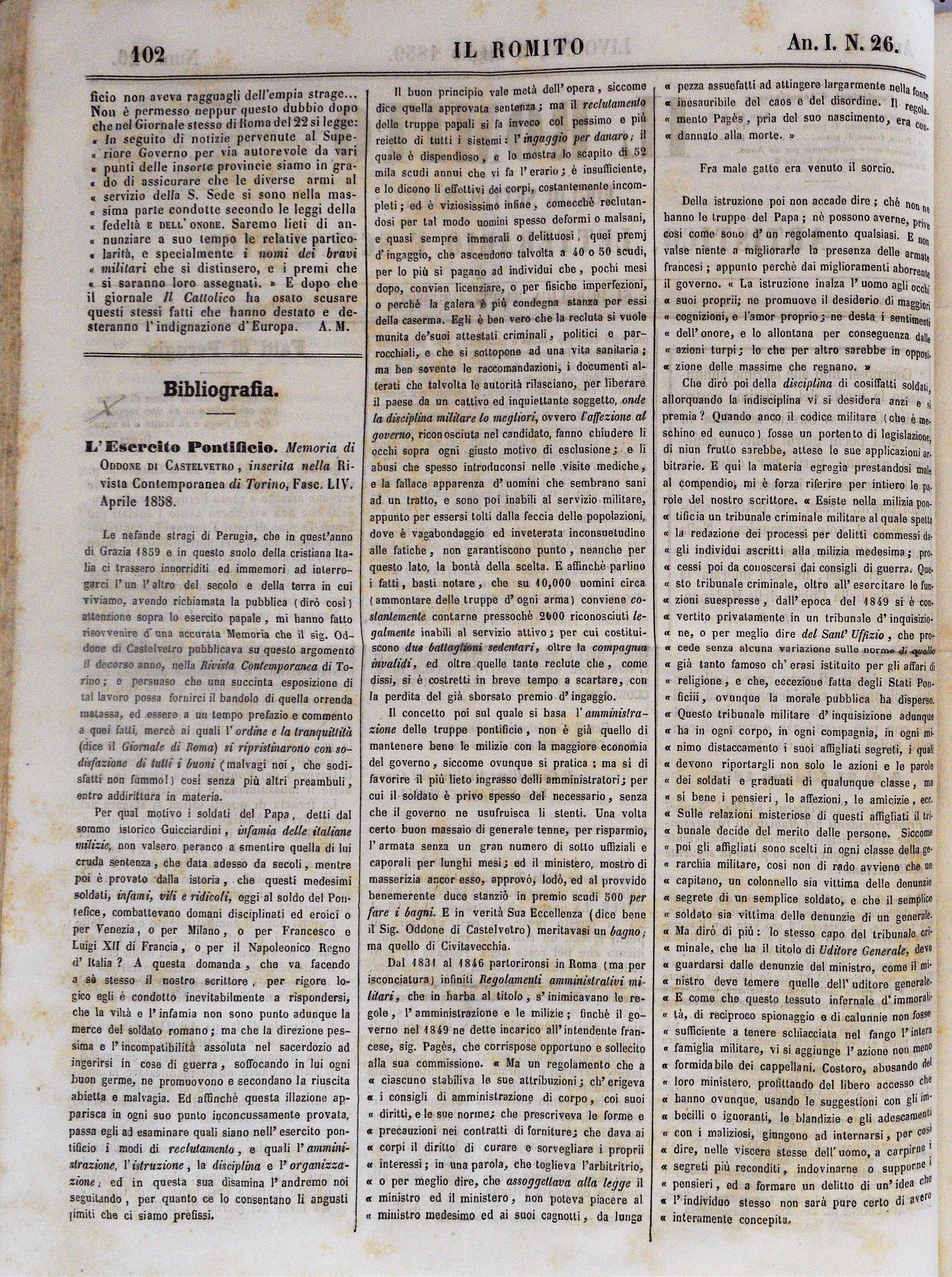A. N. D. M.Bibliografia. L’Esercito Pontificio. Memoria di Oddone di Castelvetro, inserita nella Rivista Contemporanea di Torino, Fase. LIV. Aprile 1858pp. 102-103