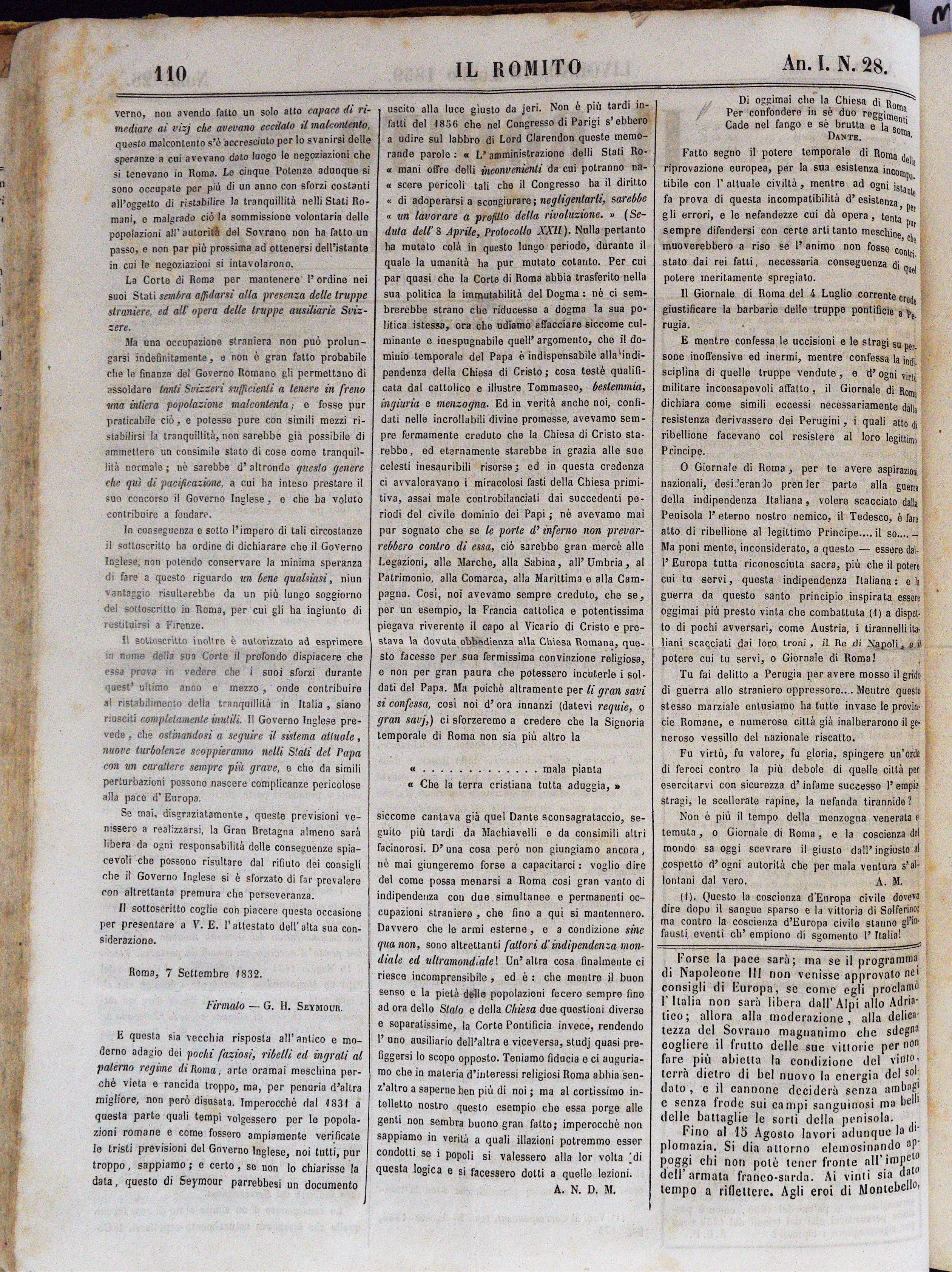 A. N. D. M.Reminiscenze Storiche. Note di Sir G. H. Seymour, Ambasciatore Inglese, al Marchese Saint-Aulaire, Ambasciatore di Francia a Roma (7 Settembre 1832)pp. 109-110