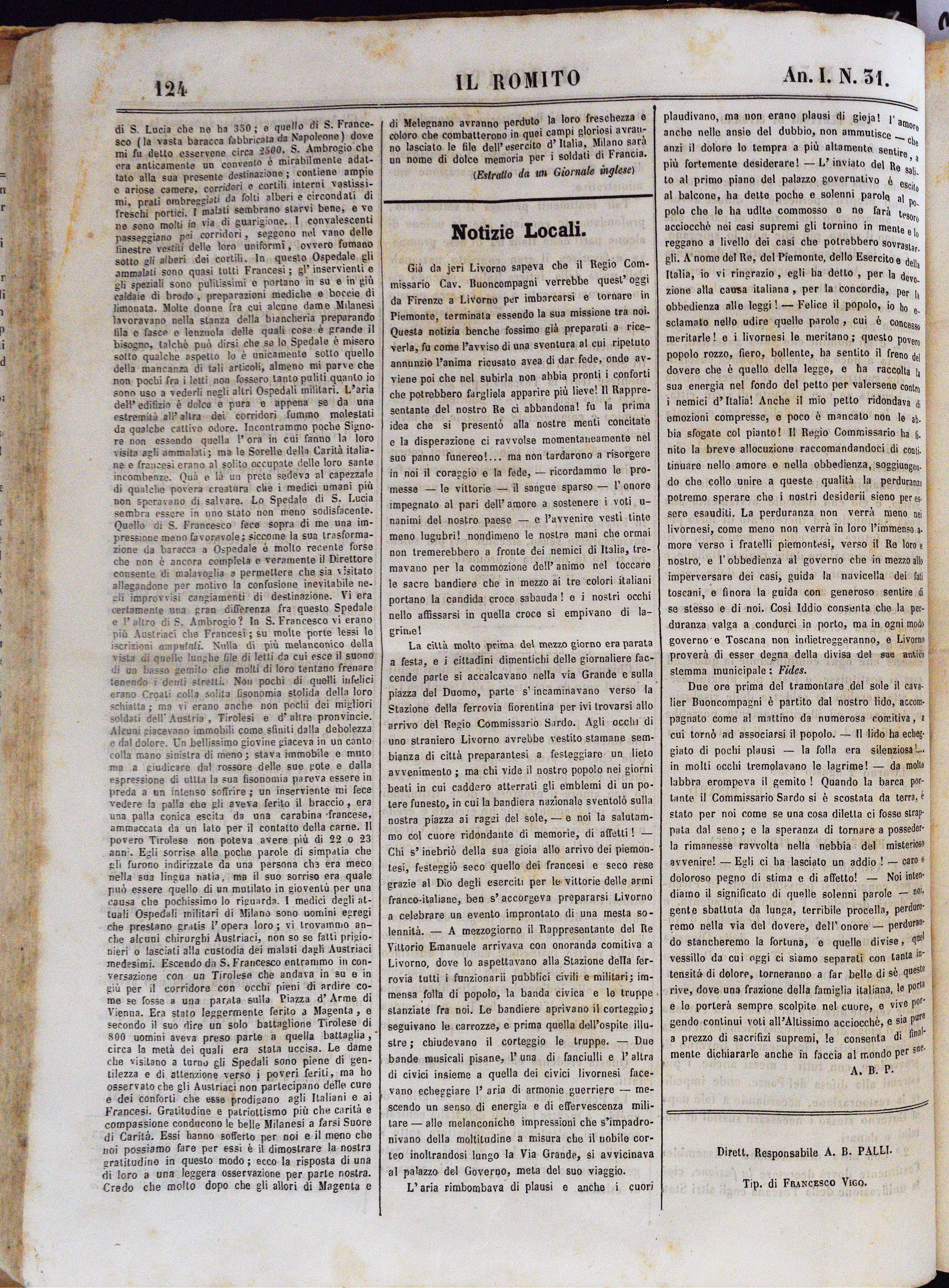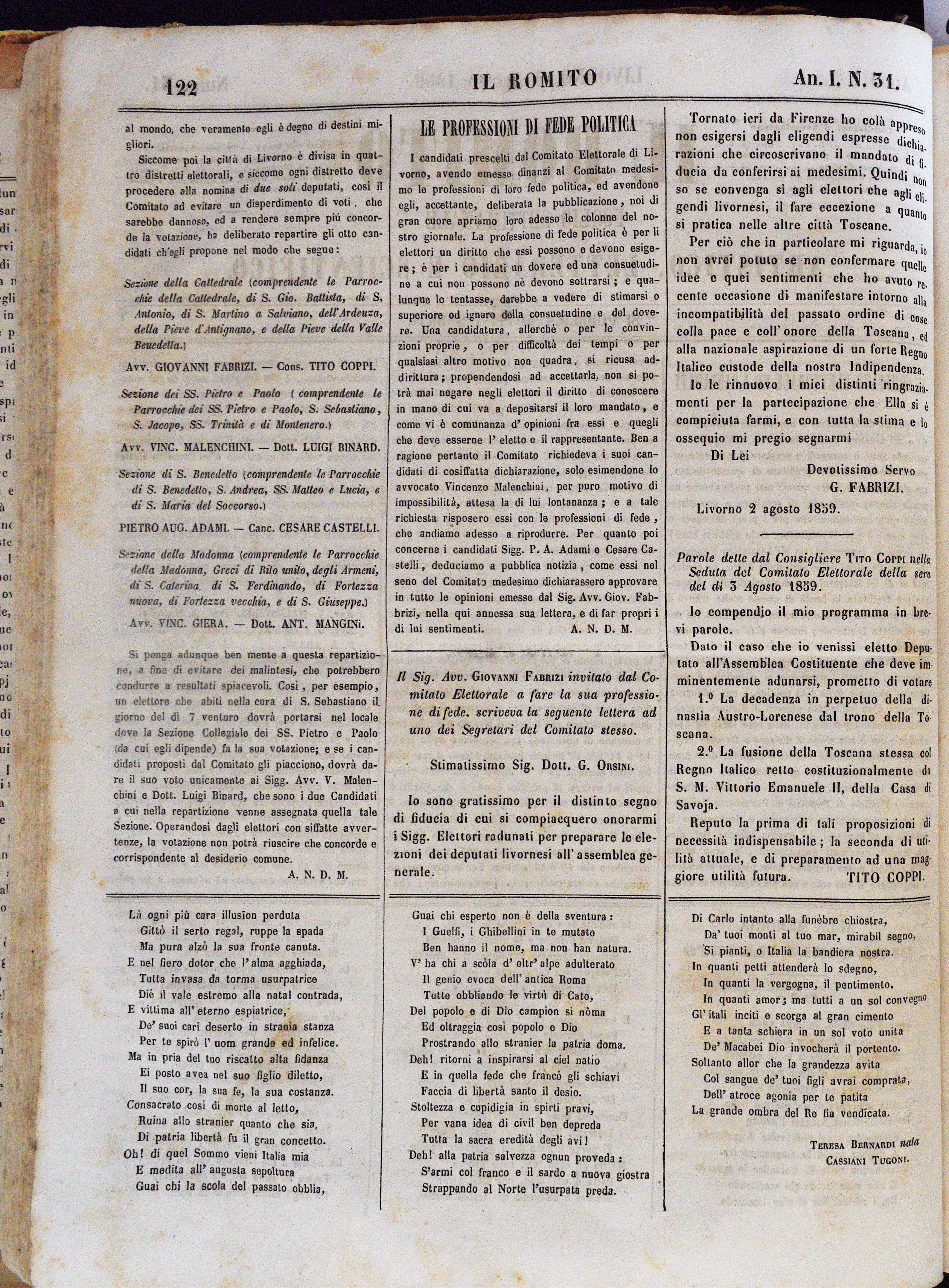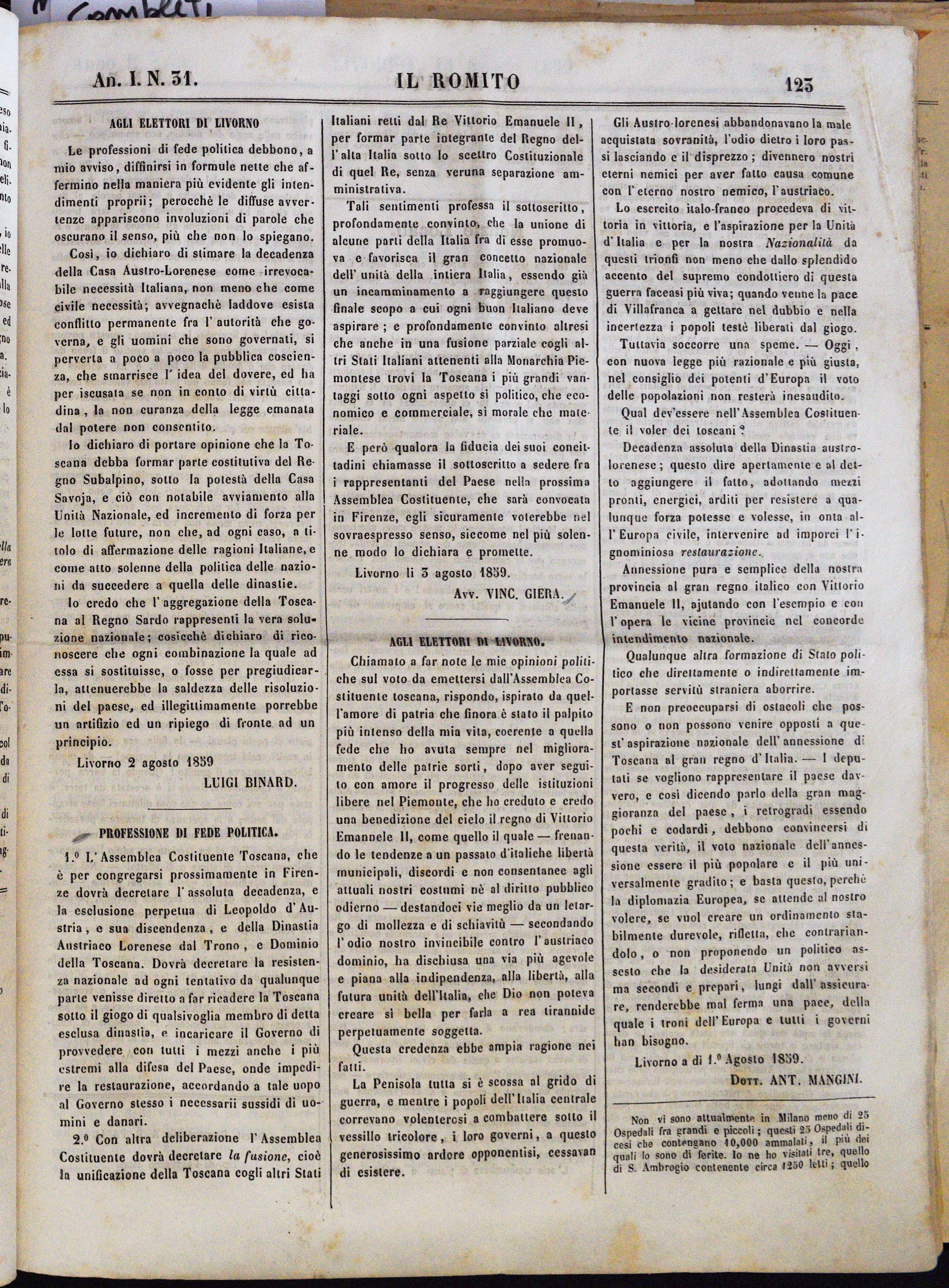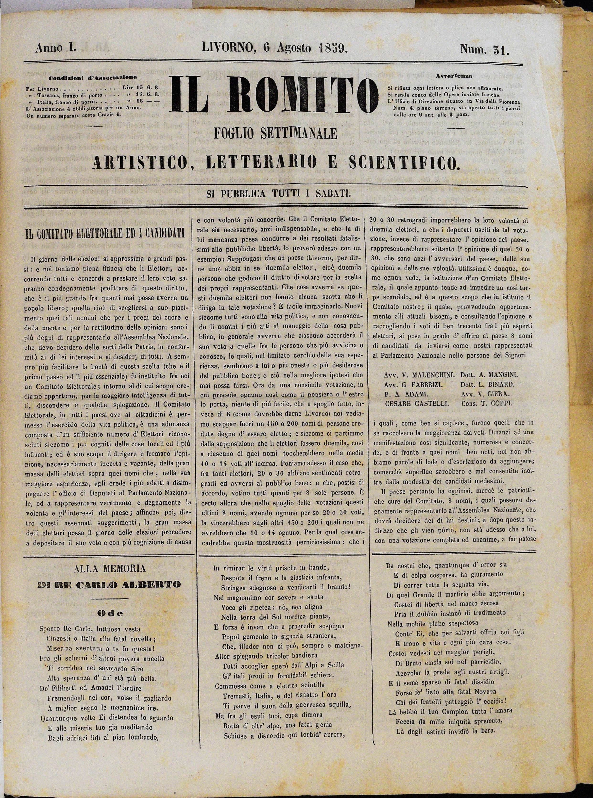Anno I. Num. 31. Livorno, 6 Agosto 1859
