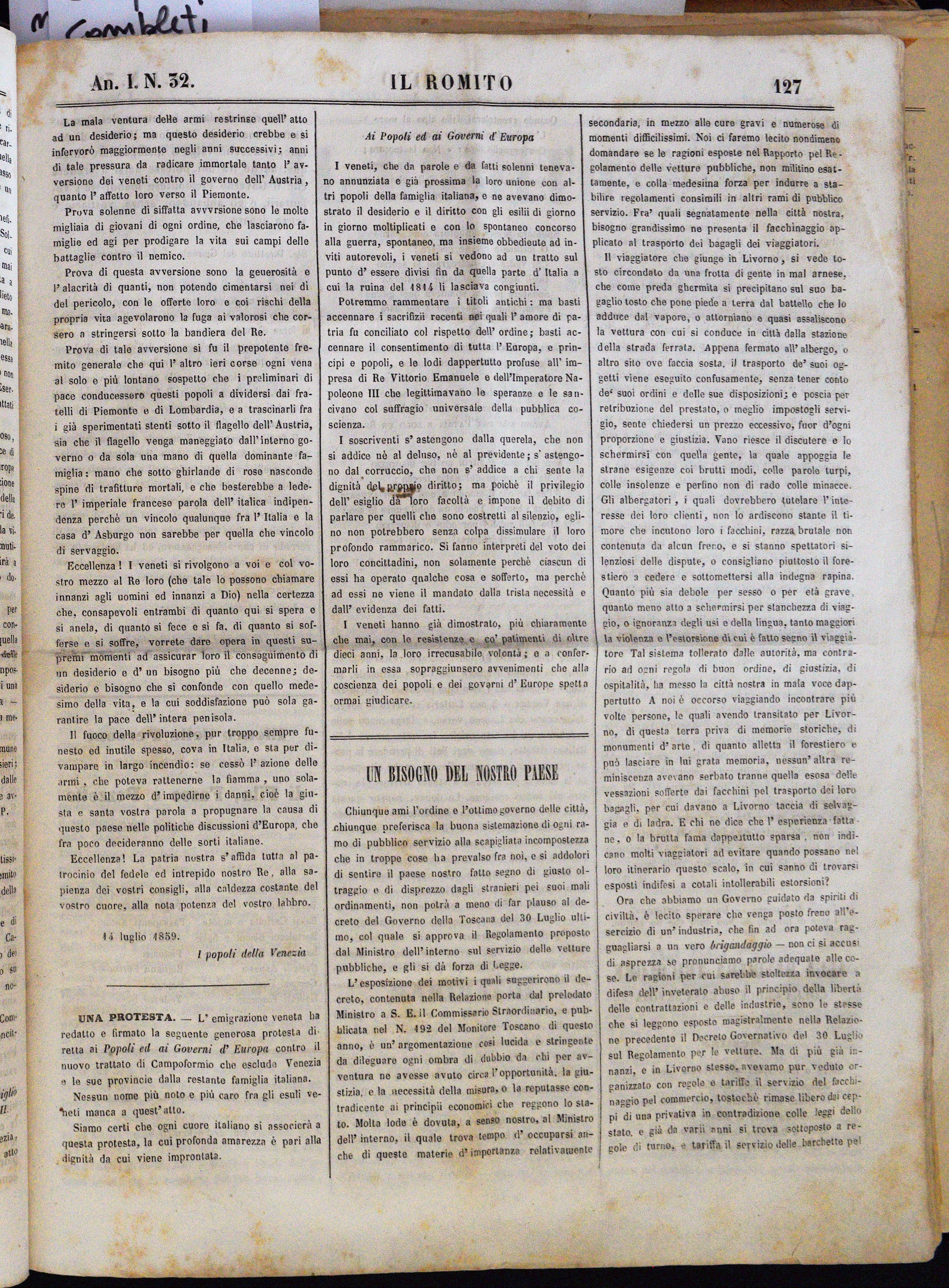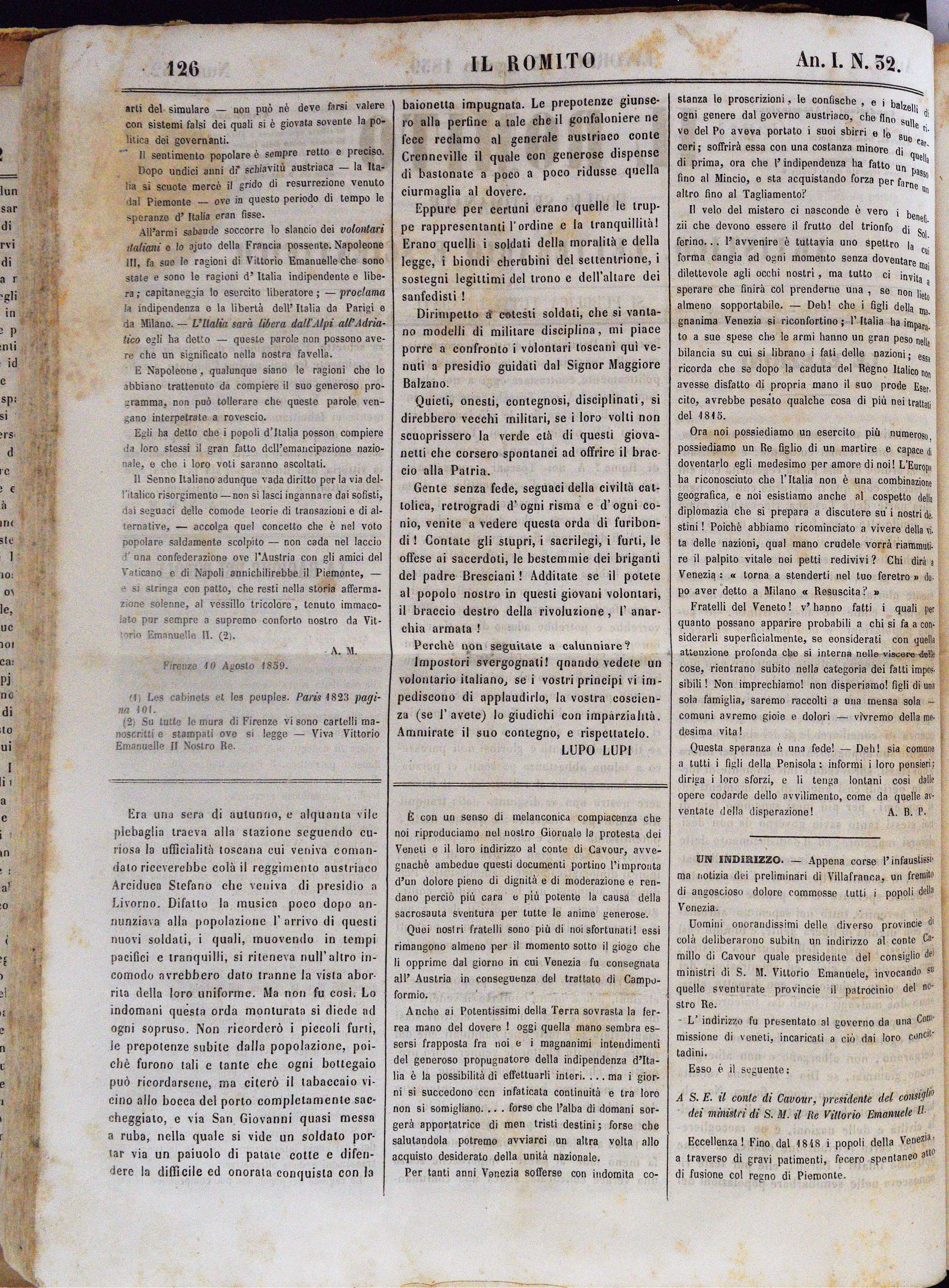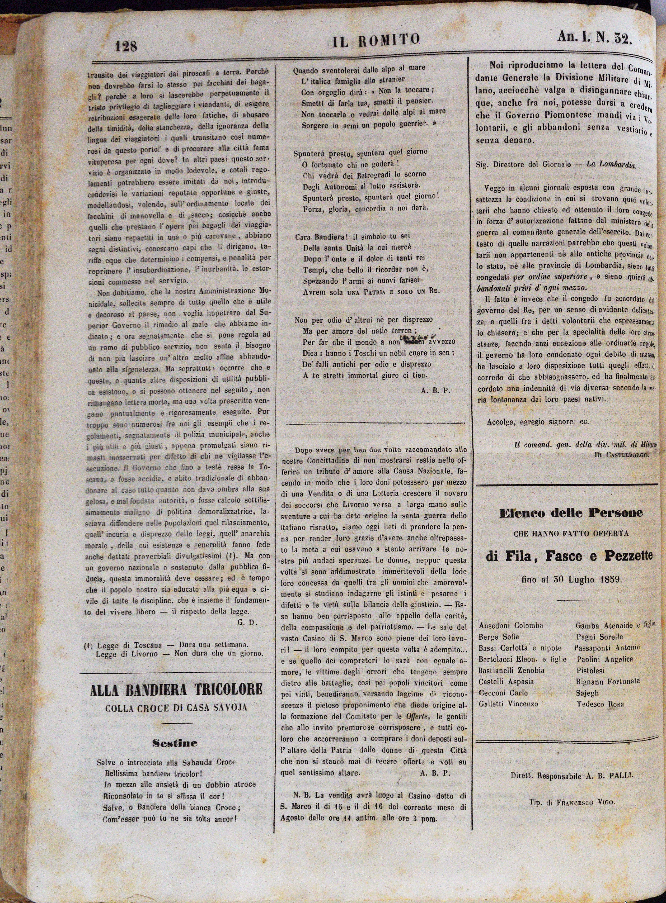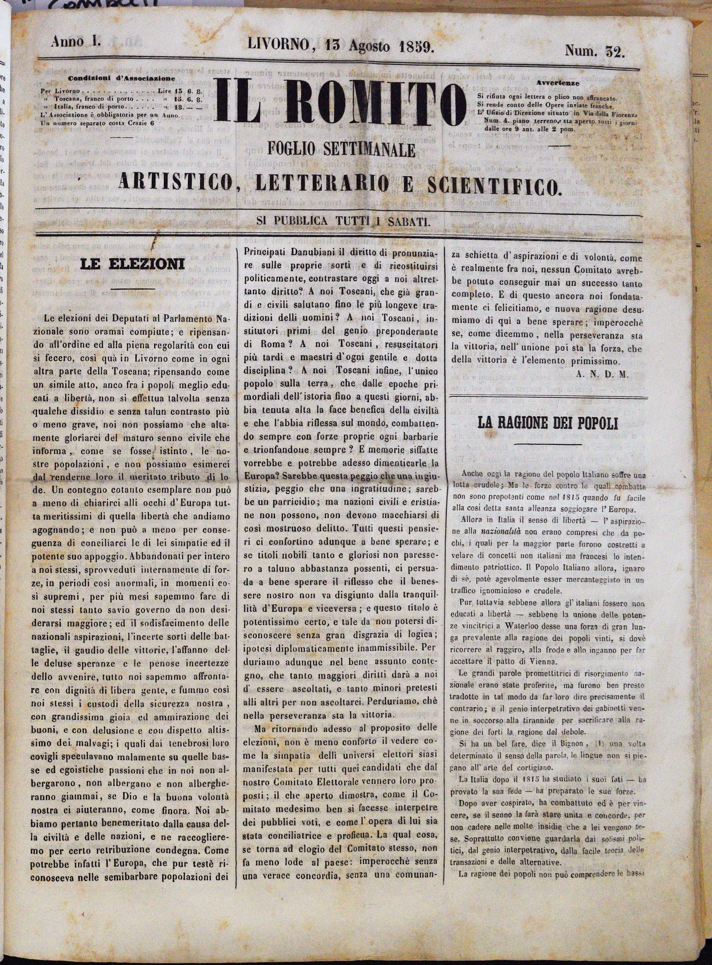 Anno I. Num. 32. Livorno, 13 Agosto 1859