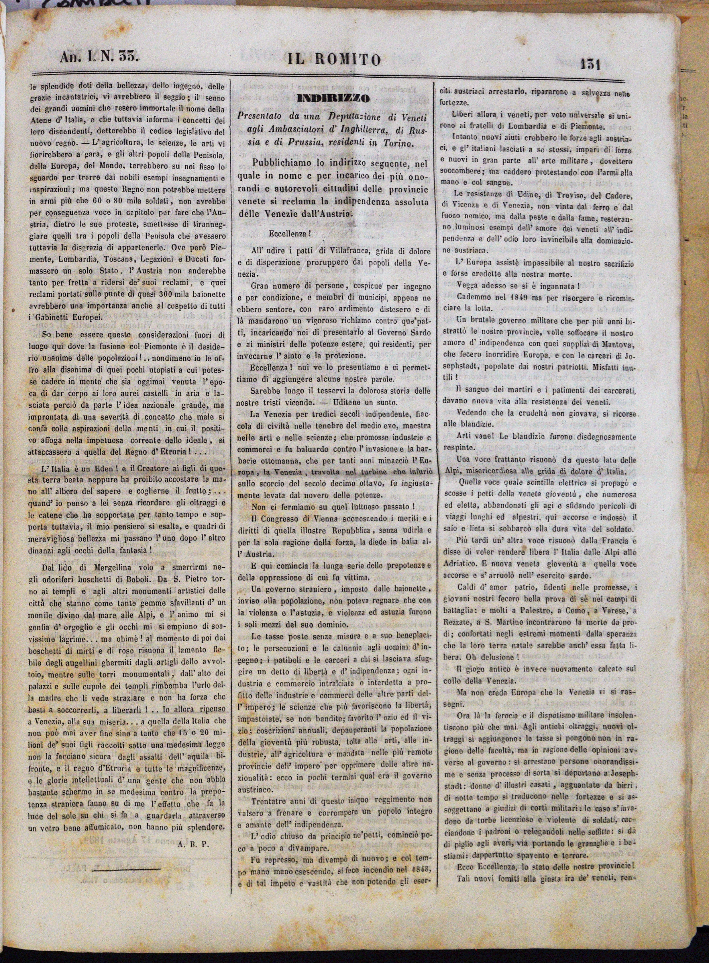 Indirizzo presentato da una Deputazione di Veneti agli Ambasciatori d’Inghilterra, di Russia e di Prussia, residenti in Torinopp. 131-132