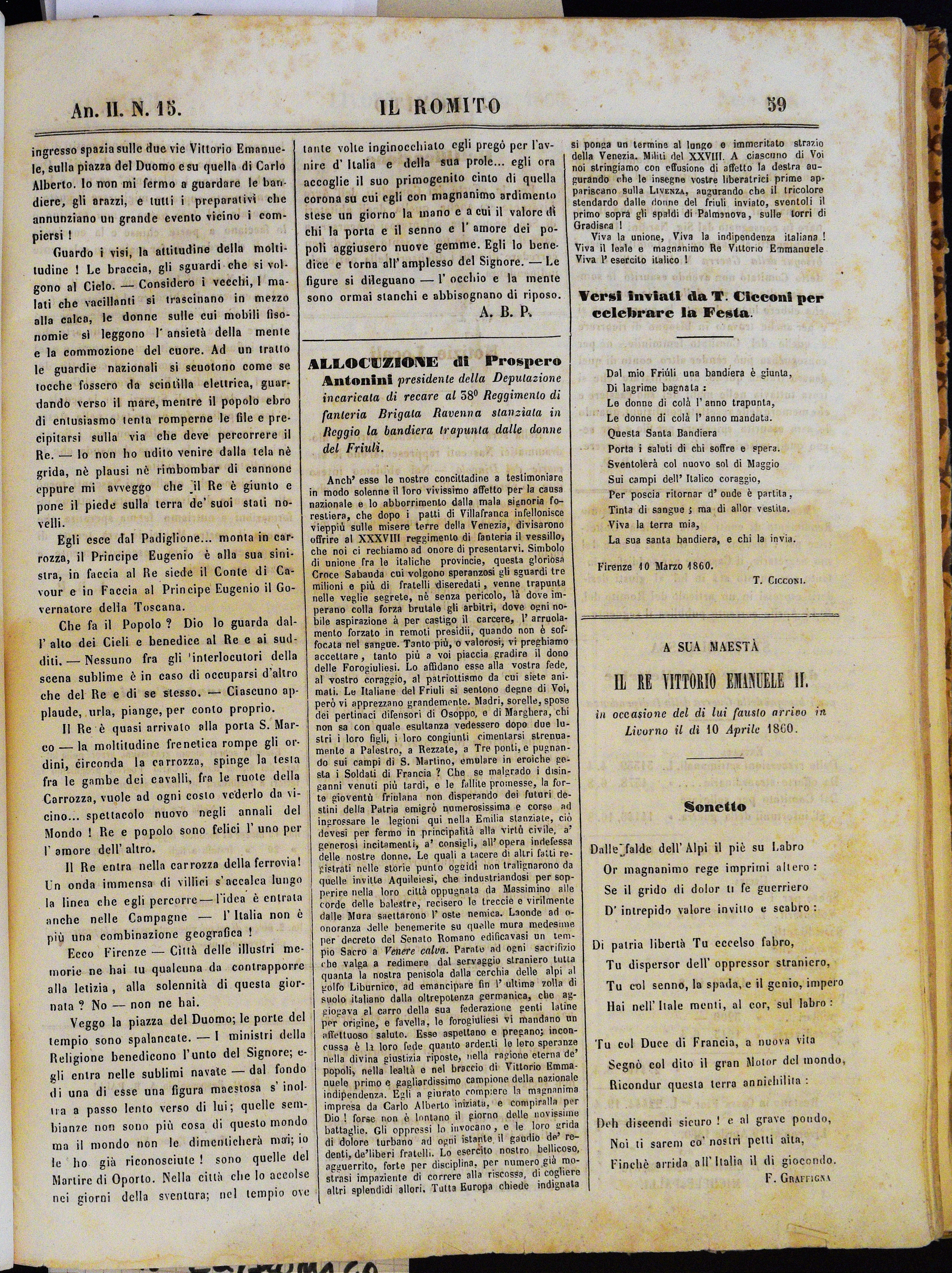 A sua maestà Il Re Vittorio Emanuele II in occasione del di lui fausto arrivo in Livorno il di 10 Aprile 1860. Sonetto. F. Graffignapp. 59