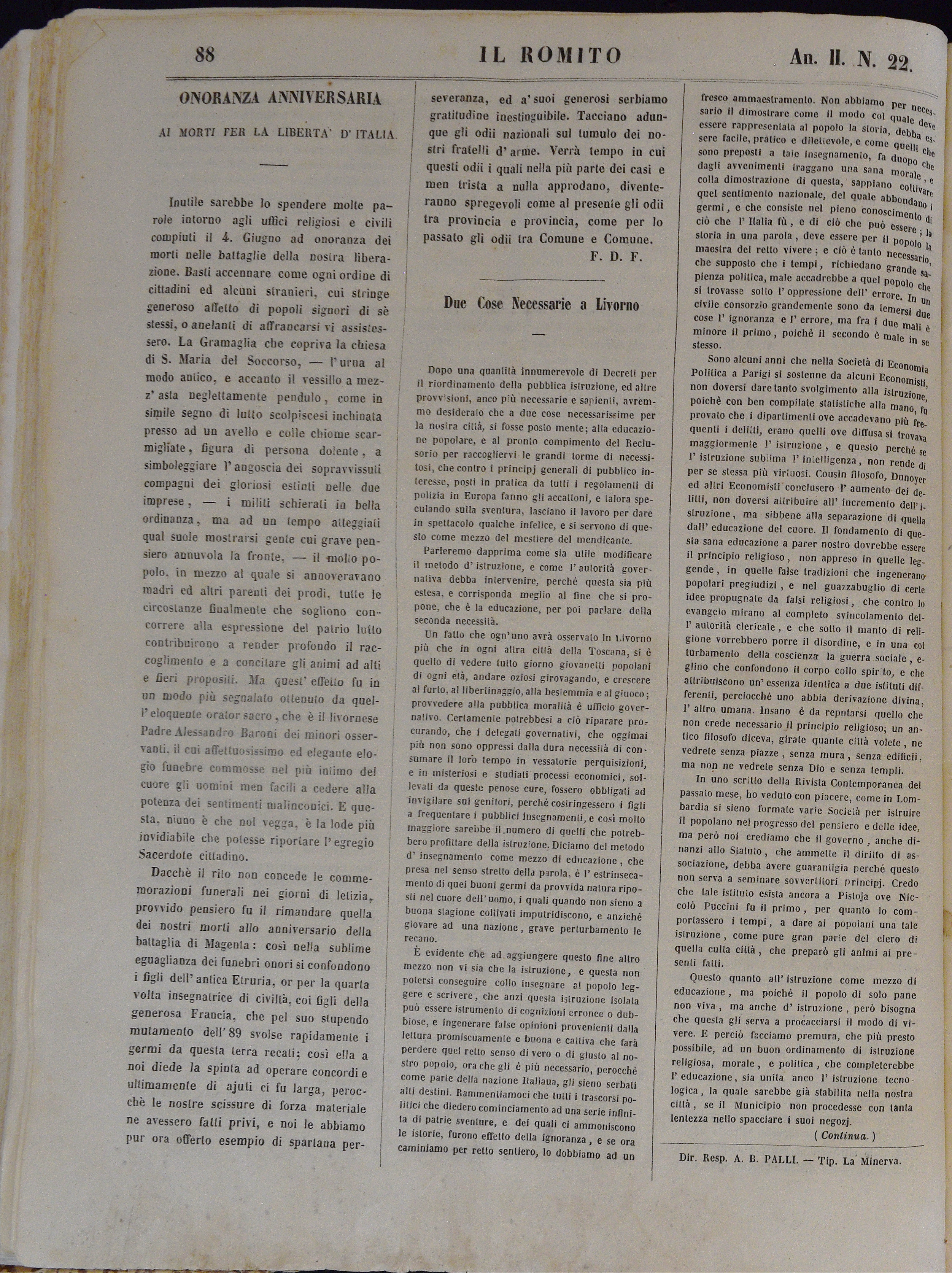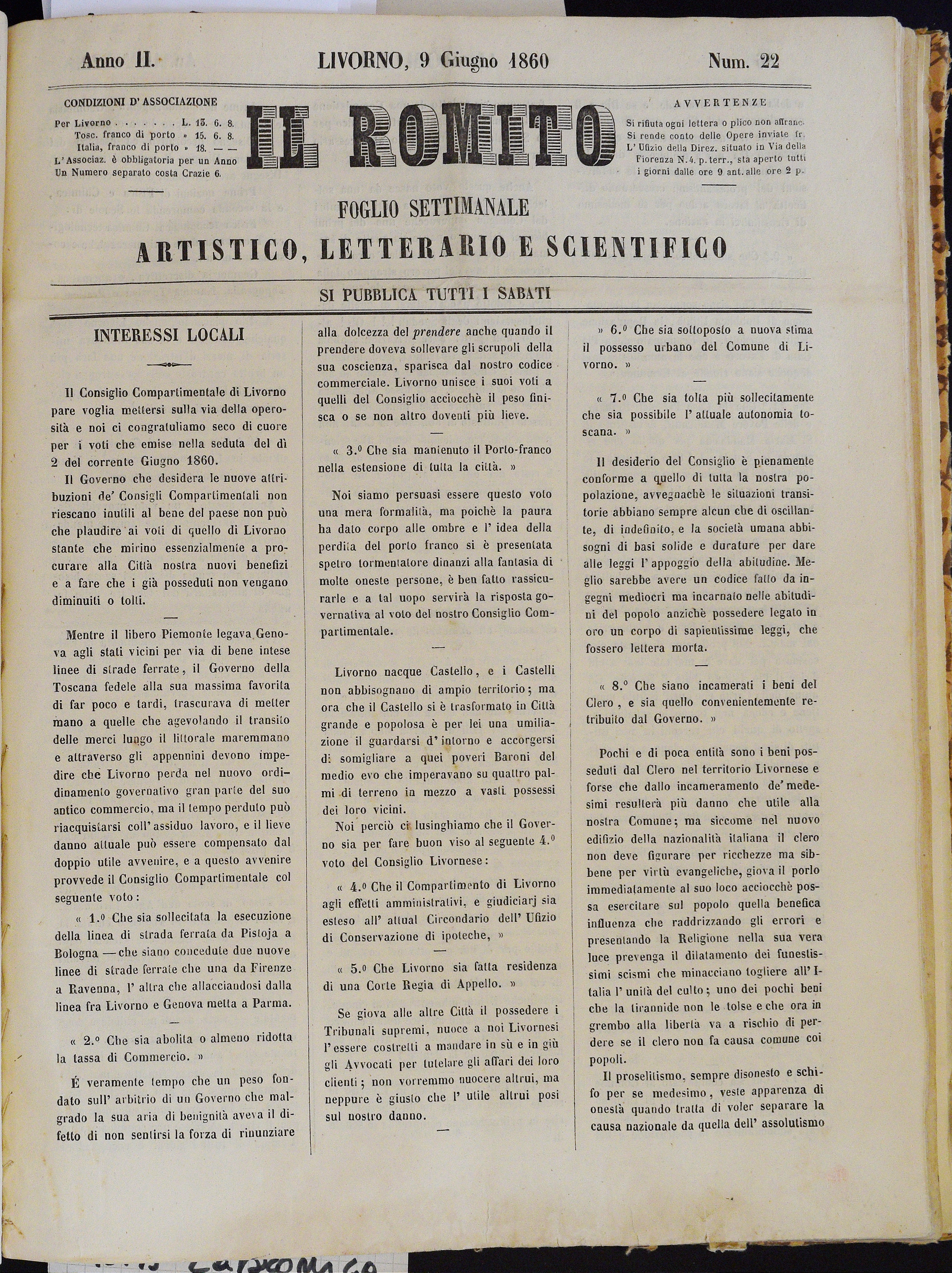 Anno II. Num. 22. Livorno, 9 Giugno 1860