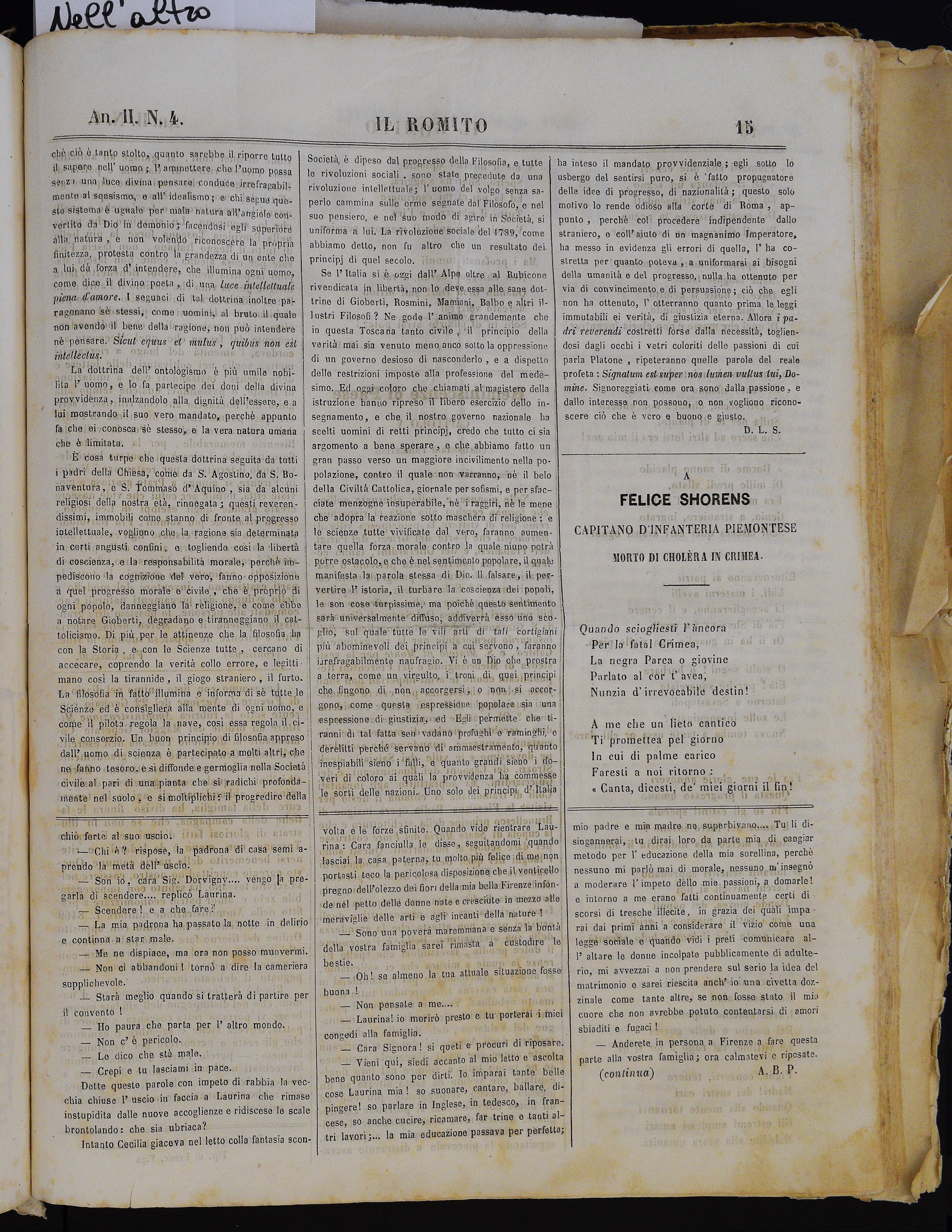 . A. B. P.A Felice Shorens. Capitano d’infanteria piemontese Morto di cholèra in Crimeapp. 15-16