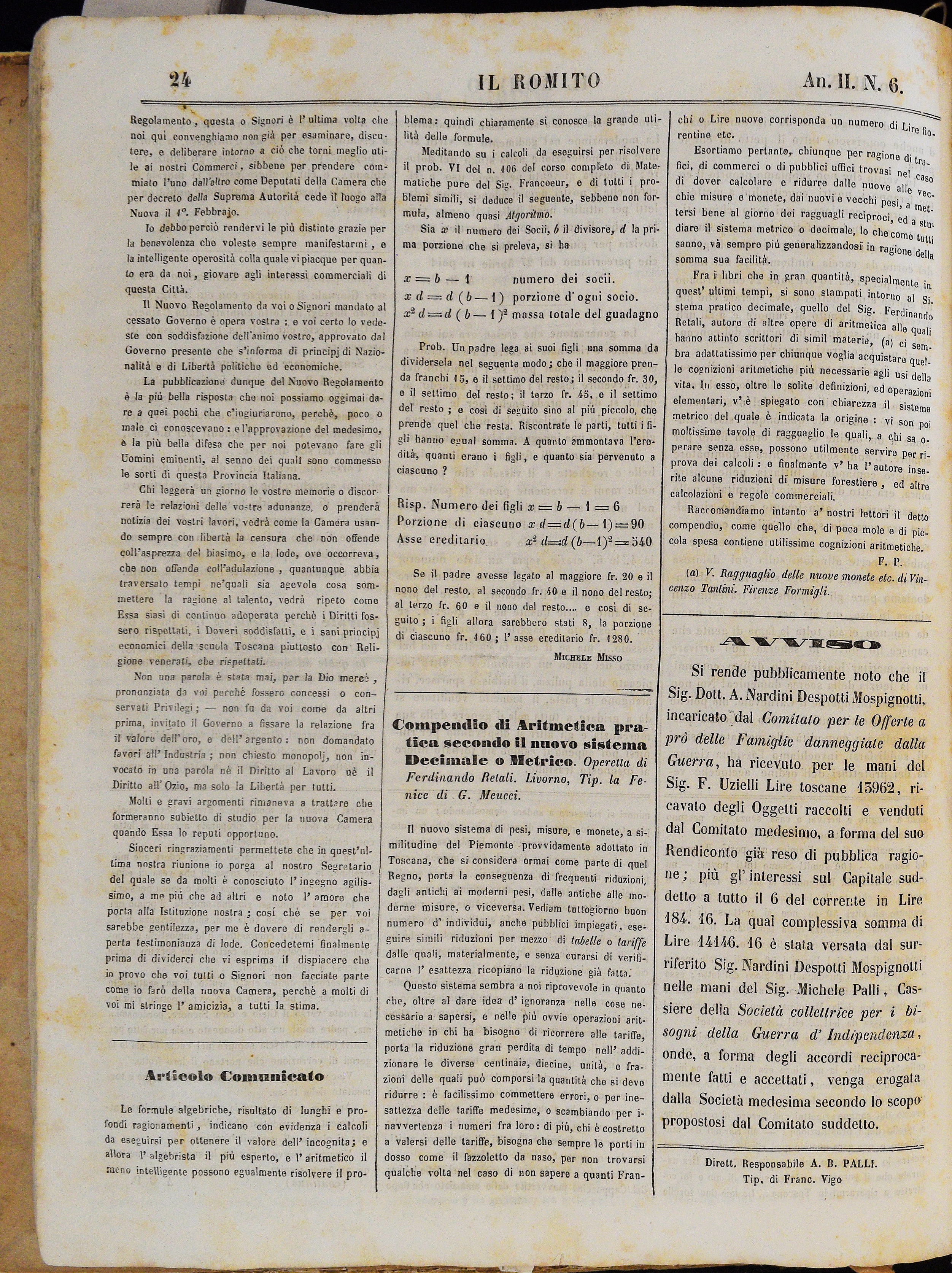 Tip. la Fenice di G. Meucci. F. P. (?)Compendio di Aritmetica pratica secondo il nuovo sistema Decimale o Metrico. Operetta di Ferdinando Retali. Livorno,pp. 24